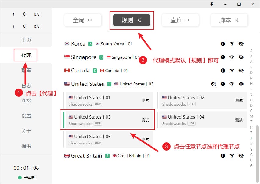 在添加完订阅地址之后,需要选择一个代理节点使用,点击软件主界面左侧的 代理 选项卡,软件右上角代理规则处默认保持 规则 即可,代理模式主要有以下四种: